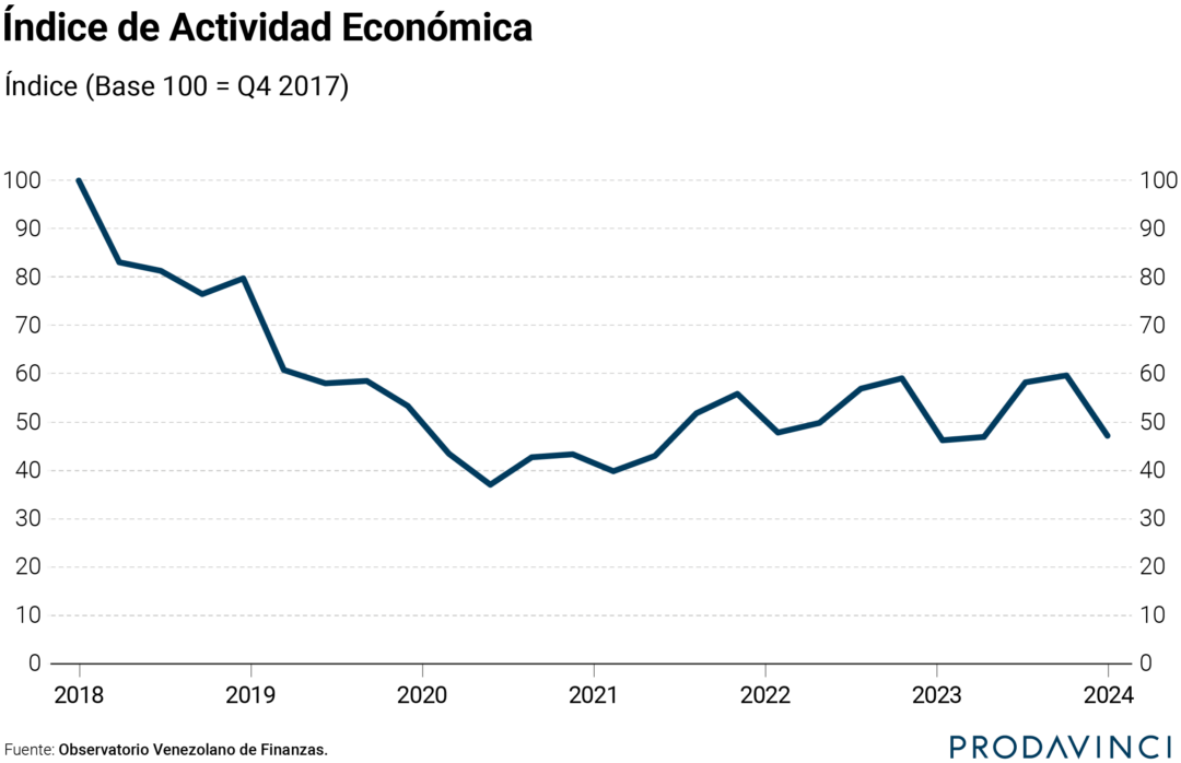 El Observatorio Venezolano de Finanzas (OVF) mide la evolución de la actividad económica a través de un índice desde el año 2018. Este Índice de actividad económica cayó 52,77% entre el cierre de diciembre de 2017 y marzo de 2024. La Encuesta de Expectativas Económicas del OVF en agosto, muestra una expectativa de crecimiento de la actividad económica en 3% a final de año. En julio, la expectativa apuntaba a un crecimiento de 5%.