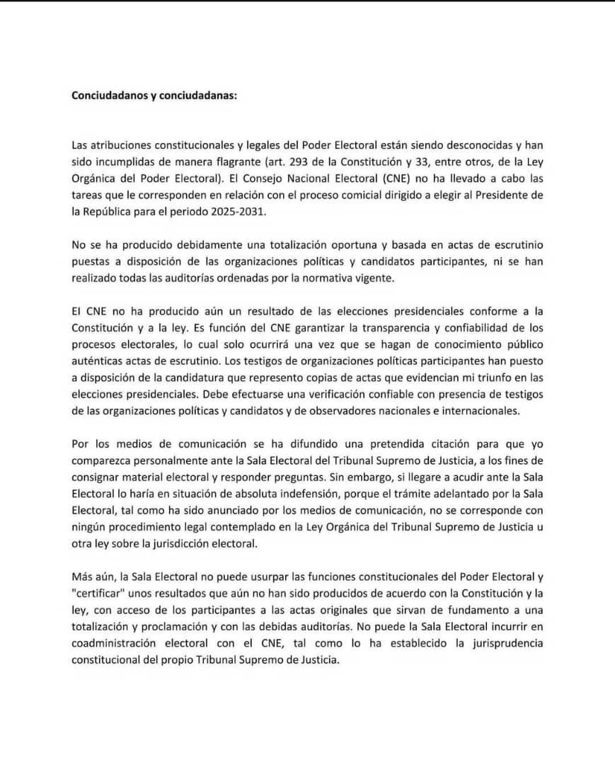 “Se me cita por los medios de comunicación a una comparecencia, pero ¿En qué tipo de procedimiento se pretende que intervenga? ¿Dónde está prevista una audiencia o trámite inquisitorio ante la Sala Electoral para certificar resultados y para determinar preliminarmente la existencia de supuestas responsabilidades penales? ¿Por qué se desconocen las facultades inquisitorias del CNE, que de acuerdo con la jurisprudencia constitucional son exclusivas? ¿Qué alcance pretende tener el interrogatorio al cual quieren someterme?”, agregó.